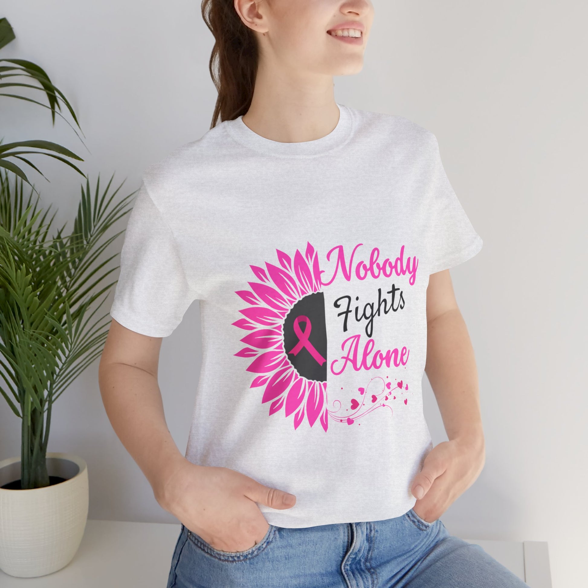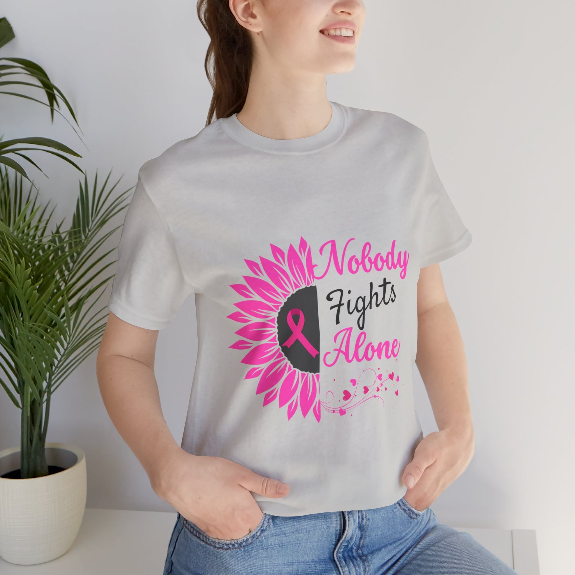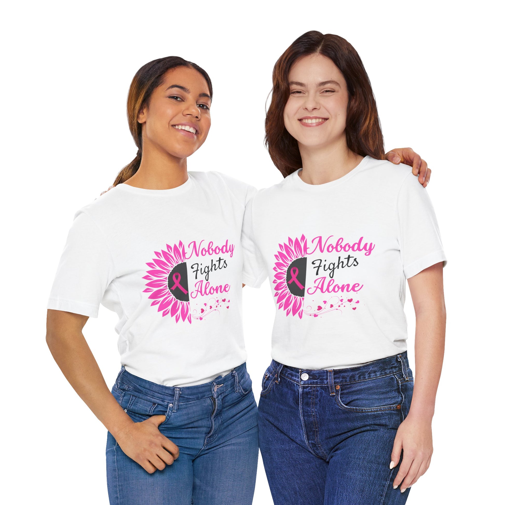 Celebrate strength and unity with this stylish unisex jersey short sleeve tee. Crafted for comfort and everyday wear, it combines a modern fit with a meaningful message. The vibrant design conveys support and solidarity, making it the perfect choice for those who want to raise awareness during Breast Cancer Awareness Month and other charitable events. Lightweight and breathable, this tee is ideal for casual outings, gym sessions, or lounging at home. Its versatile nature caters to everyone, making it a great gift for friends, family, or anyone wanting to spread hope. Wear it proudly at fundraisers, community events, or simply as an everyday reminder that nobody fights alone.